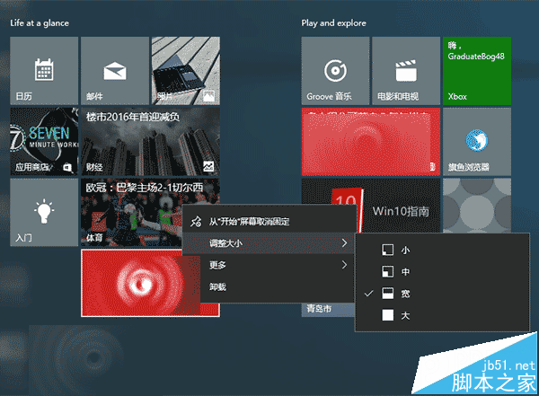 想要设置磁贴也很简单。首先是增加磁贴,只要在开始菜单相应的项目上点击右键,然后选择“固定到开始屏幕”,就会为这一项目生成磁贴。如果想删除磁贴,只需在磁贴上点击右键,选择“从开始屏幕取消固定”即可。还可以调整磁贴大小、固定应用到任务栏、为应用进行评价和共享等。