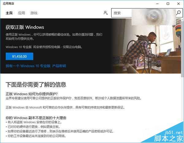 如果是新电脑首次直接安装Win10,你可以在应用商店购买Win10产品数字权利激活。购买数字激活需要先进入开始→设置→更新和安全→激活,然后选择“转到应用商店”,就可以在商店开启购买页面。只是这样购买价格不菲,专业版1458元,家庭版888元。