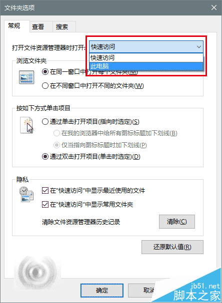Win10为了方便用户查找常用文件,把“快速启动”作为资源管理器打开后的默认首页。但有些Win7/Win8.1老用户不太习惯这种操作方式,而且这也可能泄露自己的隐私。因此可以把默认首页恢复到原有的状态,即显示系统磁盘分区等内容。用户只需在文件夹选项→常规→打开文件资源管理器时打开中选择“此电脑”,就可以恢复之前的状态。