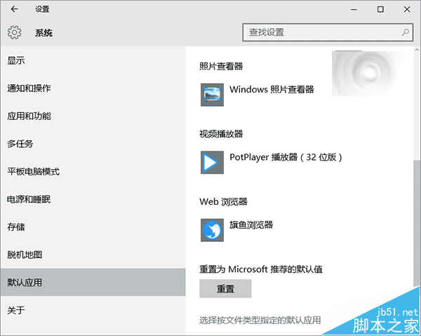 依次点击开始→设置→系统→默认应用,然后在相应的项目上点击,选择想要使用的程序。例如设定默认浏览器,可在“Web浏览器”下点击后,选择“旗鱼浏览器”作为默认项目,即时生效。