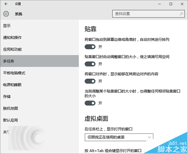 Win10继承和发扬了Windows7以来的窗口贴靠特点,不仅能够实现传统的最大化、还原和半屏效果,还有最新加入的“四分屏”和“大小自适应”效果,让“Windows本性”发挥的淋漓尽致。这些功能默认开启,如果你觉得不习惯,可以在设置→系统→多任务中关闭。