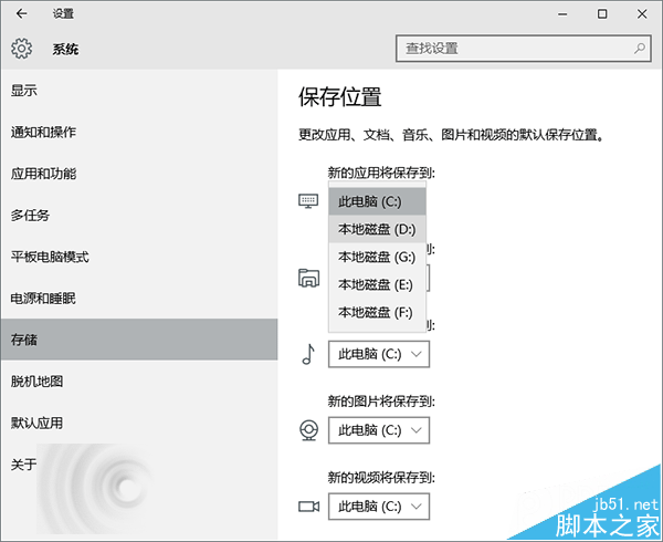 这在Win10中实现很容易,只要在设置→系统→存储中,在相应项目的下拉菜单中,选择合适的分区,更改文件和应用的保存位置即可。