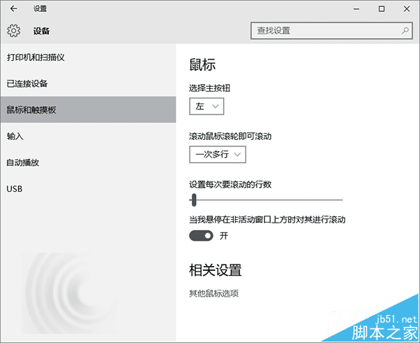 Win10中提供的鼠标设置项目和传统控制面板区别不大,如果你知道在Win7/Win8.1中的设置项含义,Win10中也同样适用。进入“设置”后,点击“设备”,选择“鼠标和触摸板”就可以对鼠标进行设置,包括左右手适配,滚轮滚动幅度,以及非活动窗口滚动支持等内容。