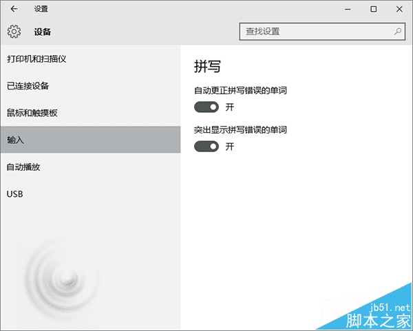 在Win10中,系统本身具有文本纠错功能,该功能同样默认开启,这对于有外语需要的用户来说尤为方便。相关设置项在“设备→输入”中,分别为“自动更正”和“突出显示”拼写有问题的单词,不需要这种帮助的用户可以关闭这两个选项。