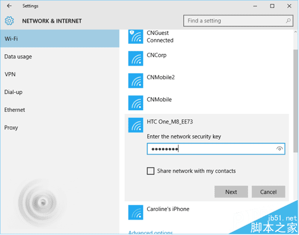 如今无线设备使用越来越多,不管是平板电脑还是手机,无线网WiFi的连接是必不可少的环节。和Windows7/Windows 8.1类似,带有无线网卡的设备想要连接WiFi,只需在任务栏点击网络无线连接图标,在可用连接出单击,输入密码即可连接到相应网络。也可以在设置→网络和Internet→Wi-Fi中进行连接,效果相同。