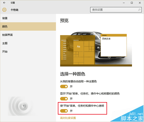 为了体现Win10在颜值和功能两方面都很强大的特性,微软特意恢复了一部分源于Vista和Win7的Aero透明效果。这些特效体现在开始菜单和任务栏部分调节项目,比如音量、网络、操作中心等。理论上,安装完Win10后这些效果默认开启,如果你发现并没有开启,可在桌面点击鼠标右键,选择“个性化”,然后点击左侧“颜色”,在最下方的选项开启“使开始菜单、任务栏和操作中心透明”。
