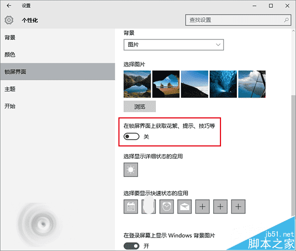 这项功能是Win10免费进程中的重要组成部分。广告以锁屏壁纸的形式进行推送,并且在其中标记了商品链接等内容,但总体上并不影响美观程度,甚至有很多用户都希望看到这种养眼的广告。不过广告终究是广告,如果这些内容影响到了你的工作,那么可以通过设置来屏蔽这些内容。在“个性化→锁屏界面”中,在“背景”选择“图片”或“幻灯片放映”,然后关闭“在锁屏界面上获取花絮、提示、技巧等”(如上图)。