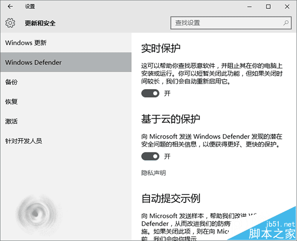 如果你不知道Windows Defender怎么用,那就“由他去好了”,因为本身也用不着怎么管它。如果非要想“管管它”,可以在设置→更新和安全→Windows Defender中操作。这里有四个项目可供调试,阿里西西建议其中的“实时保护”最好不要关闭,因为安全监控是杀软存在的重要任务之一。如果你们有特殊需求,那么这些项目最好还是不要关闭,保持默认开启状态即可。