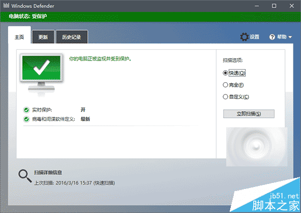 如果你想执行查毒、杀毒任务,可在设置→更新和安全→Windows Defender窗口最下方点击“打开Windows Defender”,在右侧的“扫描选项”中选择合适的查杀内容,点击“扫描”即可开始杀毒。也可以在文件资源管理器中,对单独的文件单击右键进行扫描。