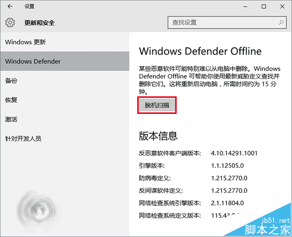 离线版杀软一般用于恶性病毒的查杀,常见于U盘等介质启动的形式。Windows Defender早就有离线杀毒模式,而Win10 RedStone(红石)正式版中该功能默认内置系统,进入设置→更新和安全→Windows Defender,在下面就可以看到Windows Defender Offline,点击“脱机扫描”后,系统将重启并且进入查杀模式,整个过程大约需要15分钟,结束后将重启至正常模式。