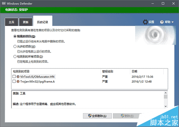 只要是杀毒软件,都会有“误杀”概率,Windows Defender也不例外。被杀软误杀的文件一般都很重要,因为不重要的话你也不可能发现。既然如此,该如何为这些文件“平反”呢?在Windows Defender界面中,点击“历史记录”选项卡,在默认“隔离的项目”下点击“查看详细信息”。选中要“解除隔离”的文件,然后点击“还原”按钮即可。这些文件都用病毒名称代替,如果你想知道它们本来的名称,需要在下方“详细信息”中进行查看。