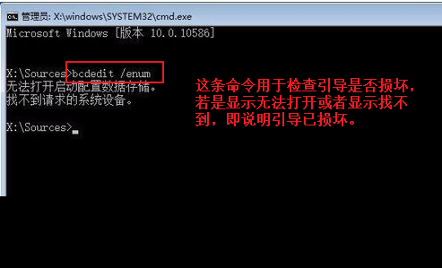 2、打开命令提示符,执行bcdedit /enum命令,如果看到如下图提示,说明引导记录已经损坏