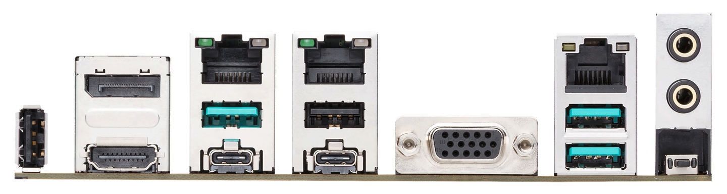 后置接口:3× USB-A 10Gbps、2× USB-C 10Gbps(其一支持 DP Alt)、2× USB-A 2.0 (480Mbps)、1× DisplayPort、1× VGA、1× HDMI、1× 10GbE RJ45、1× 2.5GbE RJ45、1× 1GbE RJ45、2× 音频插孔。