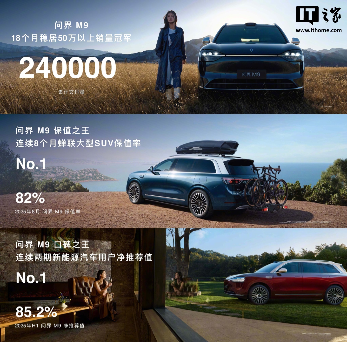 据alixixi昨日报道,鸿蒙智行官方微博宣布:每 10 辆 50 万级新能源 7 辆是问界 M9。据介绍,问界 M9 上市以来累计交付 24 万辆,18 个月稳居 50 万以上销量冠军。