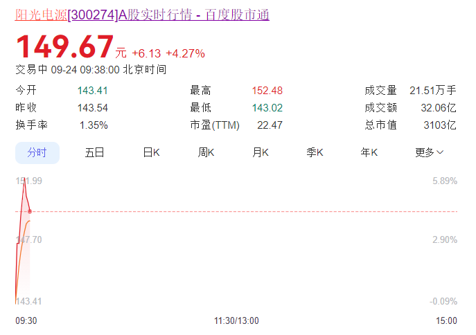 9月24日,阳光电源开盘后,盘中上涨4.27%,市值达到3103亿元,这是当前光伏行业市值最高的上市企业。