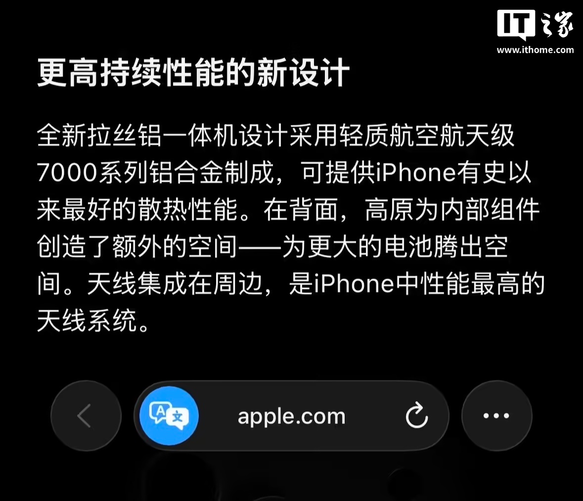 该媒体指出 iPhone 17 Pro 系列采用的航空级 7000 系列铝合金,配合超行业标准的阳极氧化硬化处理,整体耐用度值得肯定。