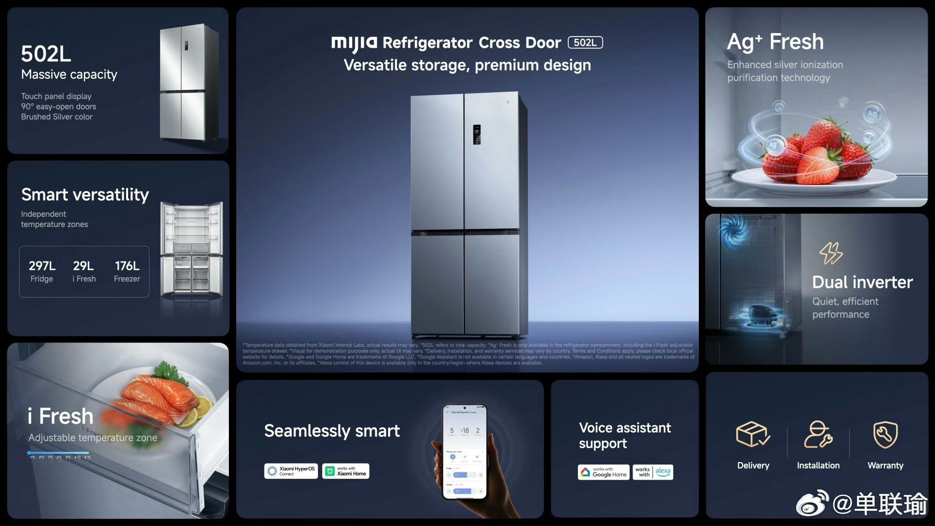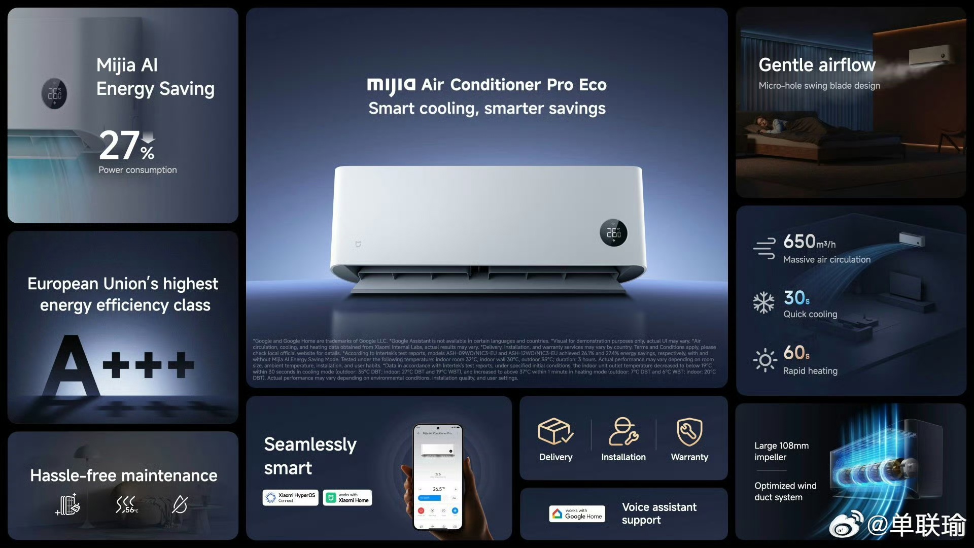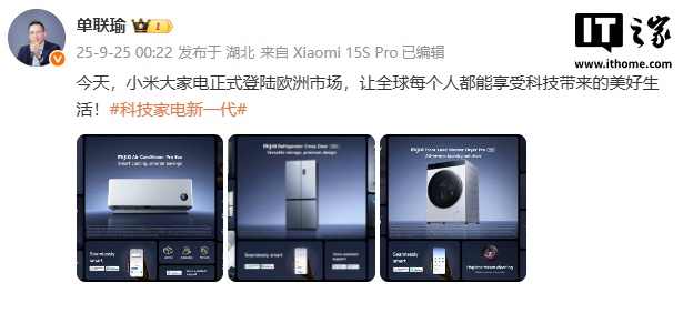 alixixi 9 月 25 日消息,小米集团大家电部总经理单联瑜今日凌晨发文称:“今天,小米大家电正式登陆欧洲市场,让全球每个人都能享受科技带来的美好生活!”此外,他还分享了三张产品海报,分别为空调、冰箱、洗衣机。