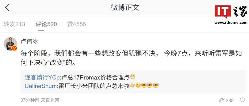 小米集团合伙人、总裁,手机部总裁,小米品牌总经理卢伟冰在雷军微博下评论补充:“每个阶段,我们都会有一些想改变但犹豫不决。”