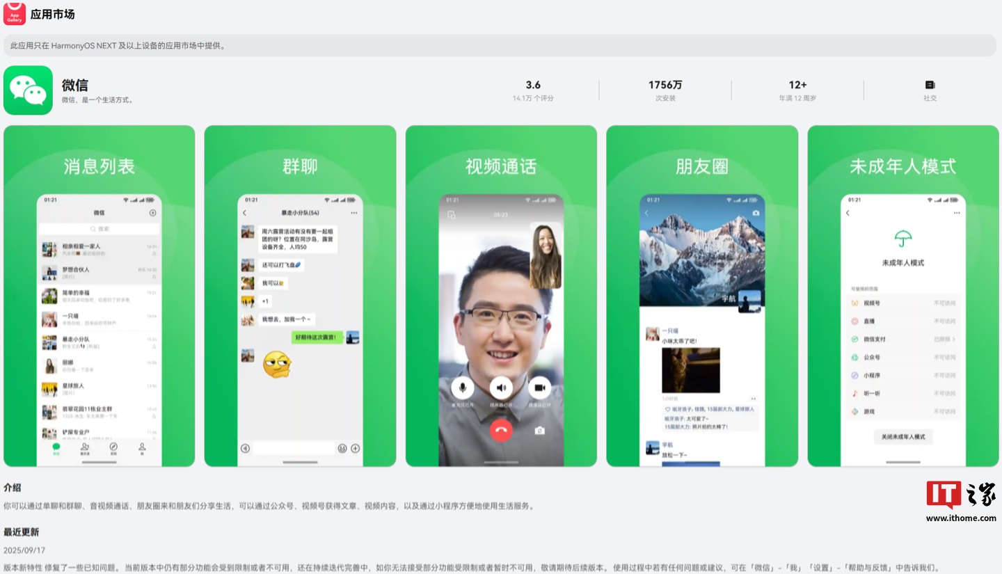 alixixi 9 月 25 日消息,微信鸿蒙版 App 昨晚在华为应用市场(App Gallery)开启 1.0.11.32(1051424)版本邀测升级(需收到短信通知后点击链接跳转安装,未收到短信需继续等待),测试时间为 2025/9/24-2025/10/23。