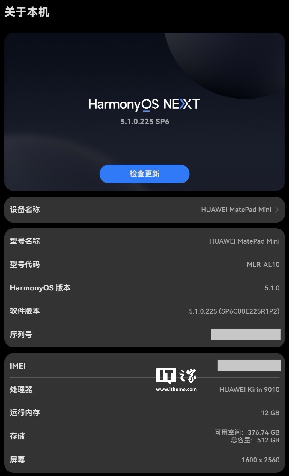 据用户反馈,华为 MatePad Mini 小平板升级鸿蒙 HarmonyOS 5.1.0.225 SP6 版本后,在关于本机页面新增支持处理器显示 —— HUAWEI Kirin 9010(华为麒麟 9010),这也是麒麟 9010 处理器首次在设备端现身。
