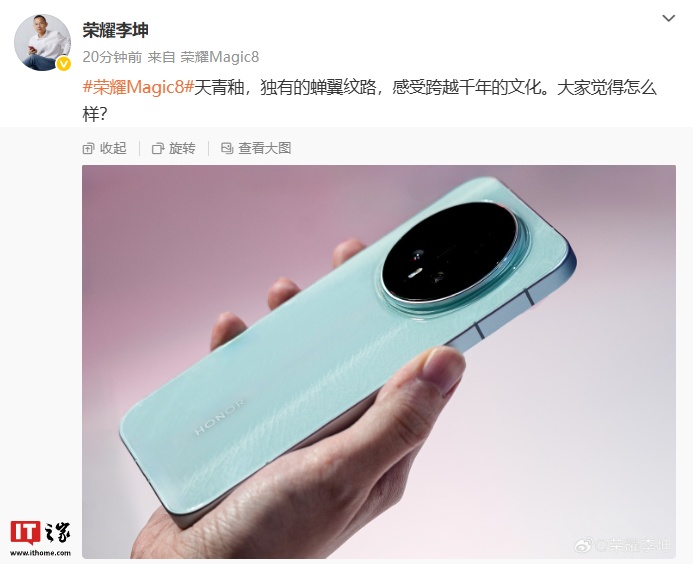 alixixi 9 月 25 日消息,荣耀终端股份有限公司旗舰手机产品经理李坤今日在微博分享了 Magic8 手机天青釉配色的外观。据介绍,该机采用直角边框设计,并点缀了独有的蝉翼纹路。值得一提的是,李坤的微博机型也已更换为荣耀 Magic8。