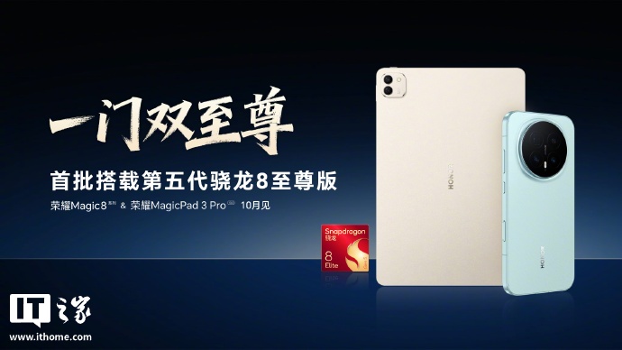 此外,荣耀手机今日宣布,荣耀 Magic8 系列手机与 MagicPad 3 Pro 平板首批搭载第五代骁龙 8 至尊版移动平台,号称“一门双至尊”。