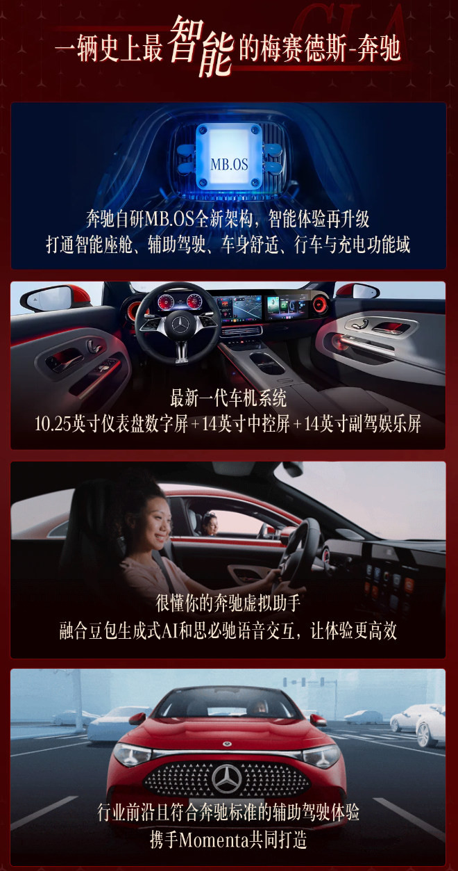 该车号称“史上最智能的梅赛德斯-奔驰”,采用奔驰自研 MB.OS 全新架构,打通智能座舱、辅助驾驶、车身舒适、行车与充电功能域。新车搭载最新一代车机系统,配备 10.25 英寸仪表盘数字屏 + 14 英寸中控屏 + 14 英寸副驾娱乐屏,奔驰虚拟助手融合豆包生成式 AI 和思必驰语音交互。该车还提供辅助驾驶功能,与 Momenta 共同打造。