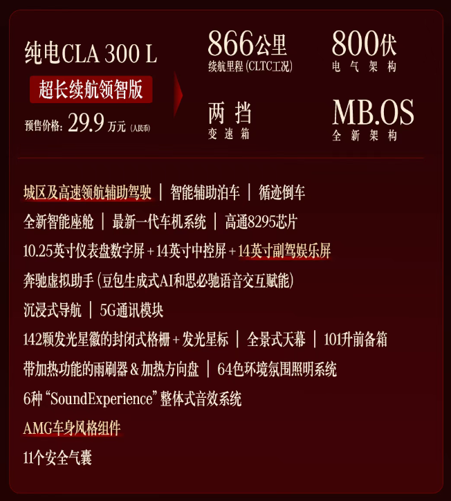 alixixi 9 月 25 日消息,奔驰全新纯电 CLA 今日开启预售,提供 300L 超长续航版、300L 超长续航领智版两个版本,售价分别为 25.9 万元和 29.9 万元。