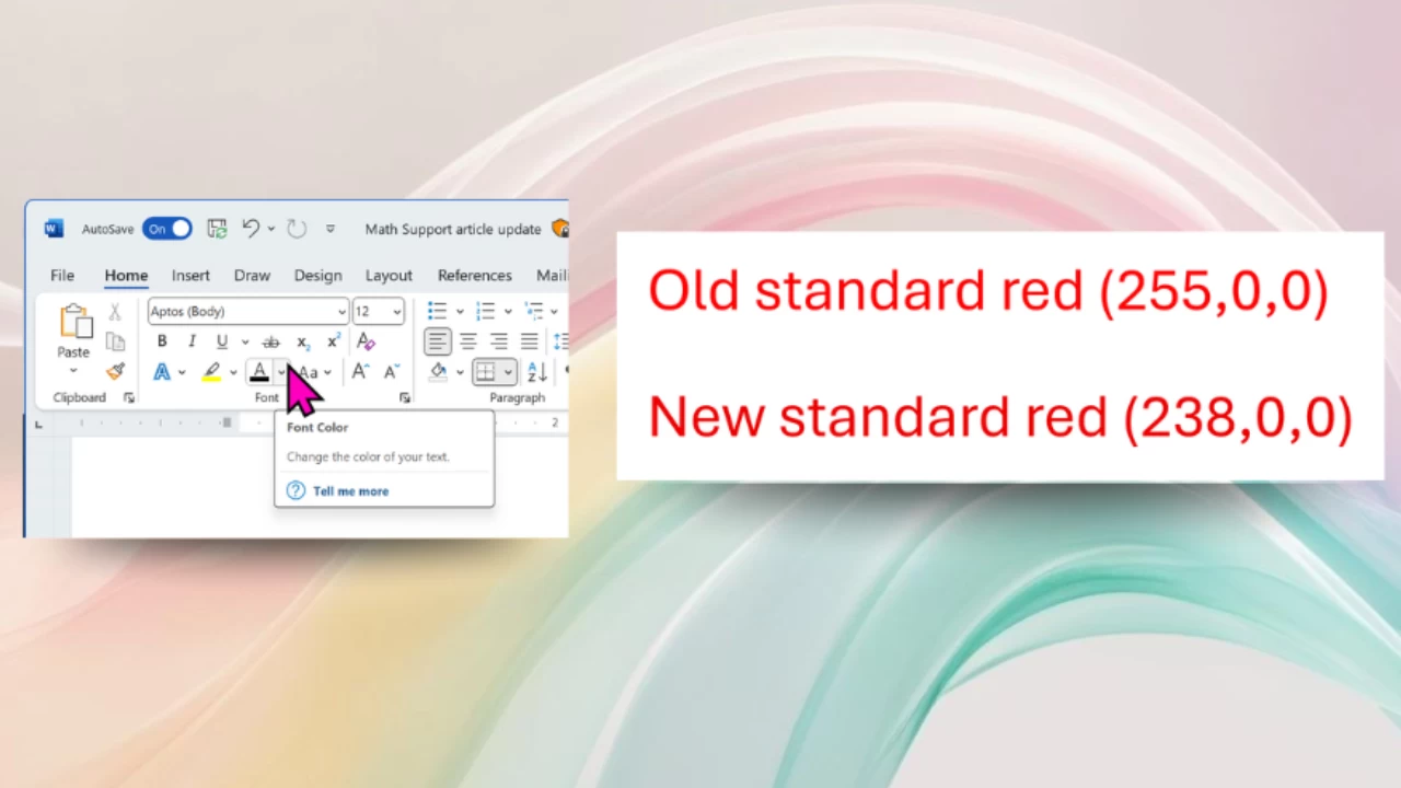 alixixi 9 月 25 日消息,微软昨日(9 月 24 日)发布博文,宣布调整 Microsoft 365 生产力套件中默认红色字体颜色,从原版红色(RGB 255,0,0)调整为新版红色(RGB 238,0,0)。