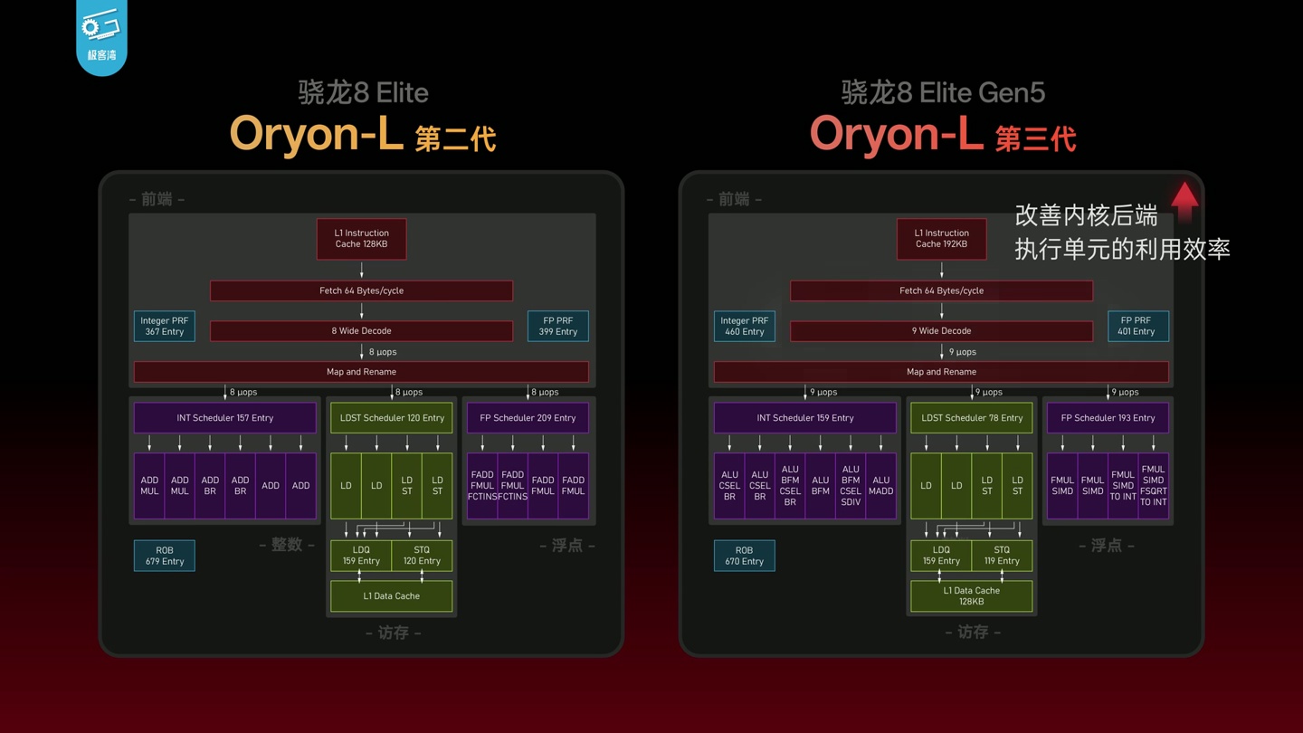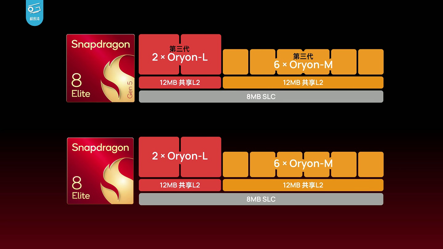 在 CPU 方面,高通第五代骁龙 8 至尊版芯片改进了超大核,改善了内核后端执行单元的利用效率,在架构方面并没有显著变化,GPU 缓存增大 50% 至 18MB,整体核心面积和前代保持一致。alixixi附上相关图片如下: