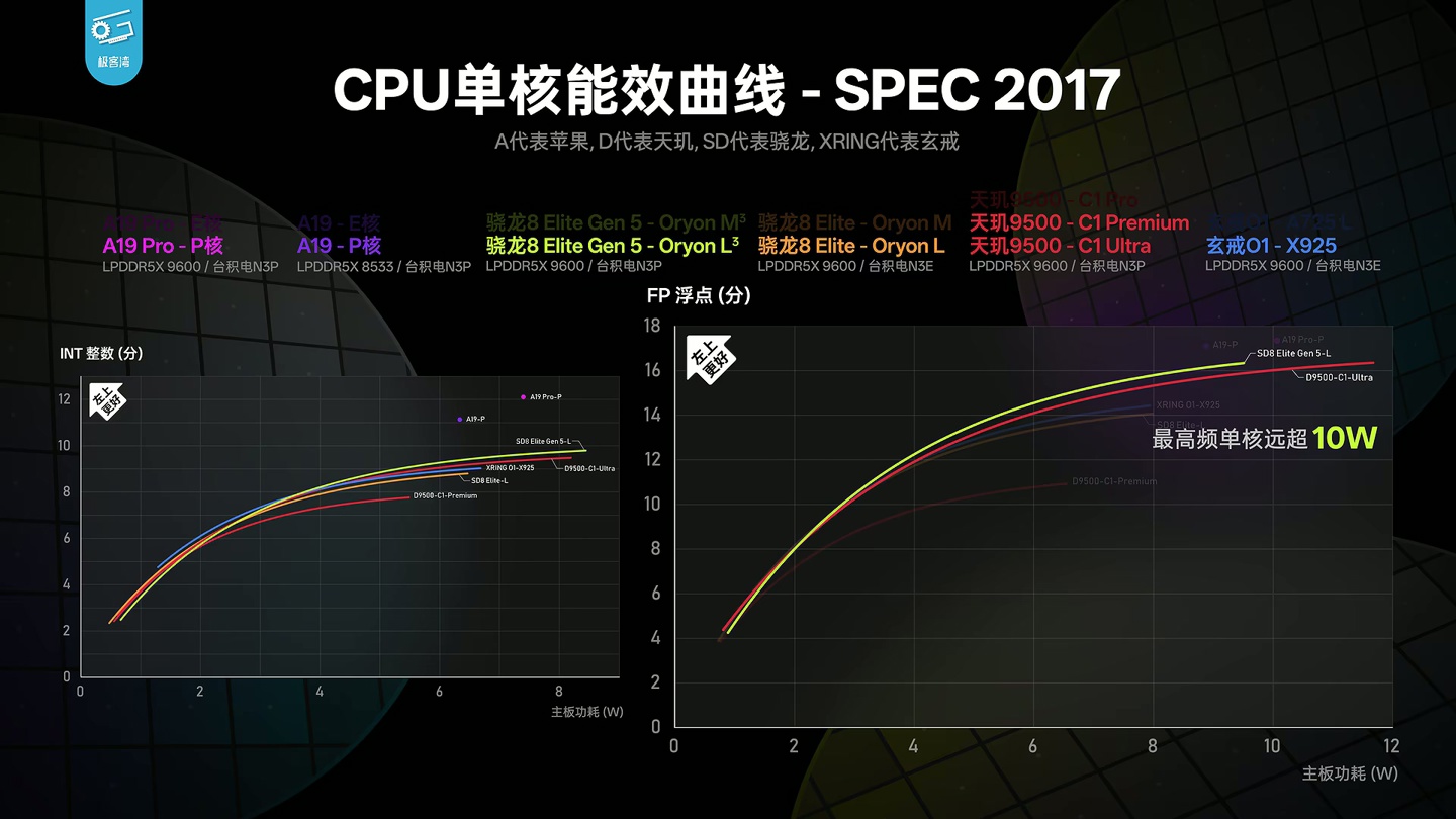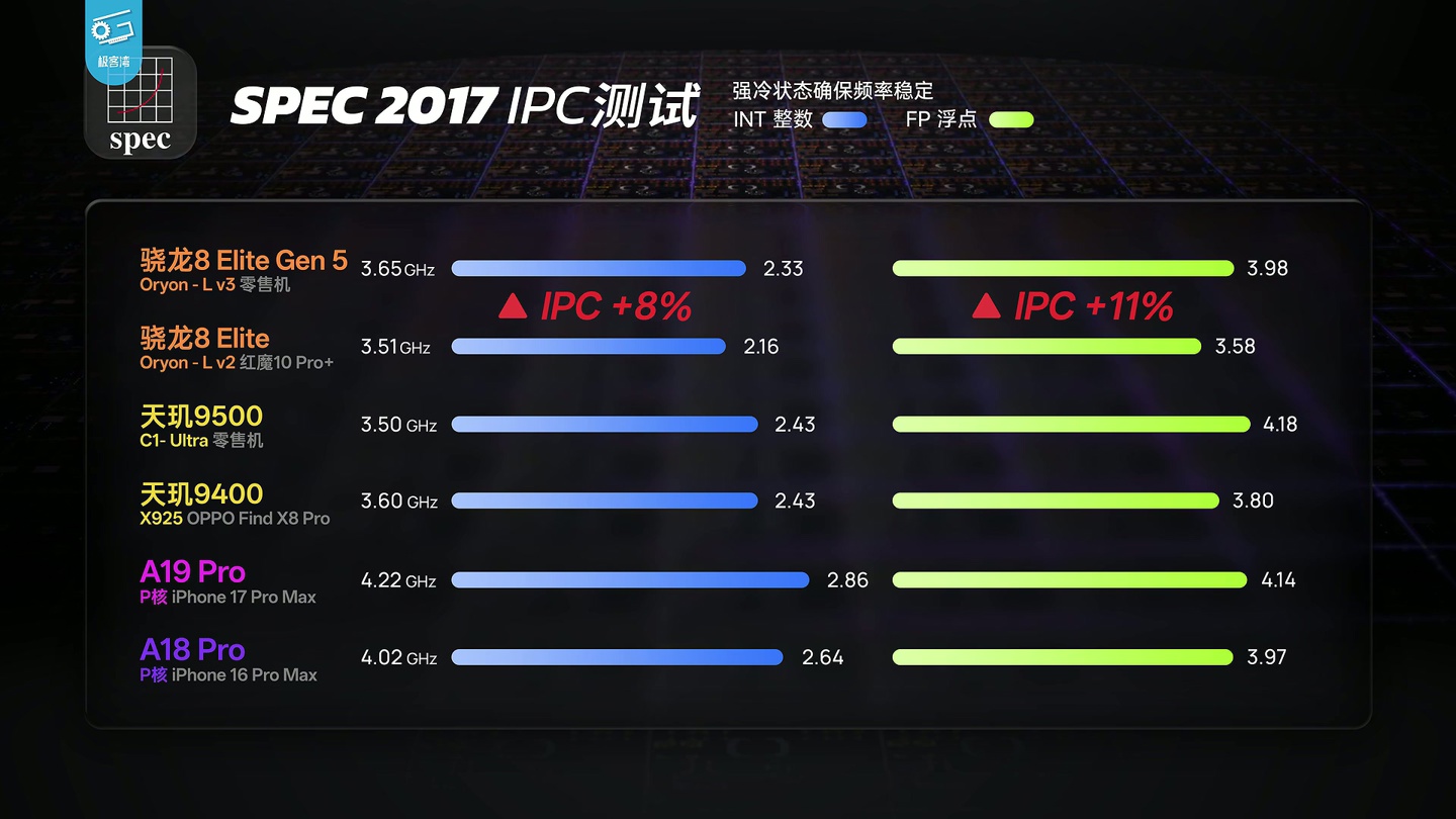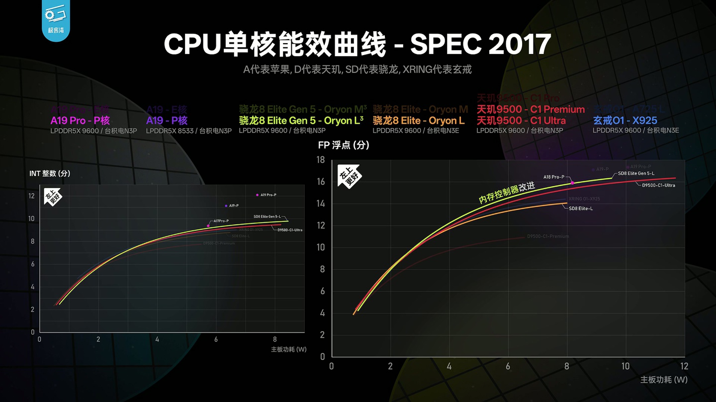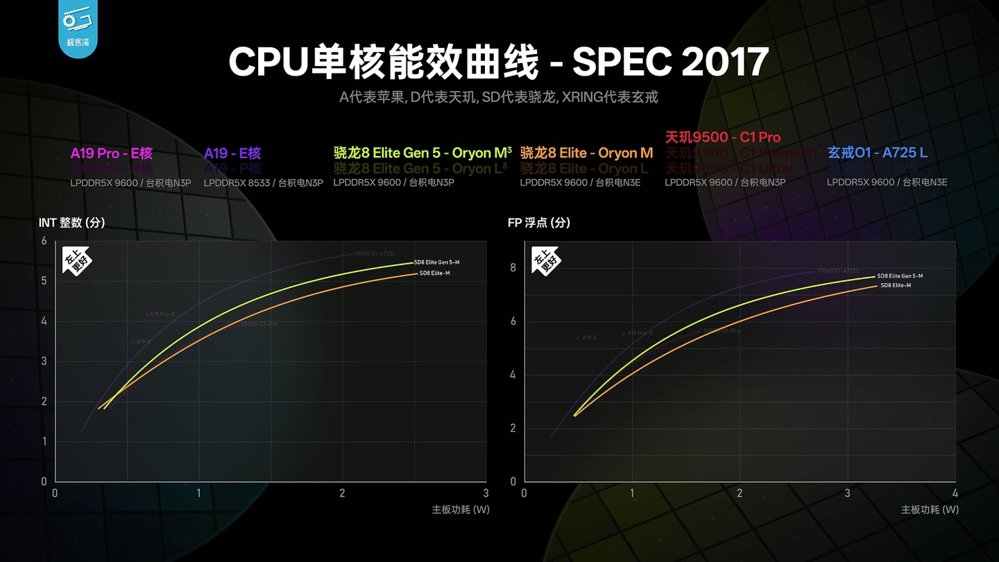 alixixi 9 月 25 日消息,@极客湾Geekerwan 今天(9 月 25 日)发布博文,分析了高通第五代骁龙 8 至尊版芯片的性能,并称:“做完 SPEC 单核分析,拉完能效曲线后,我们可以说,这就是一代稳步前进的常规升级,没有大的创新但也没有翻车”。