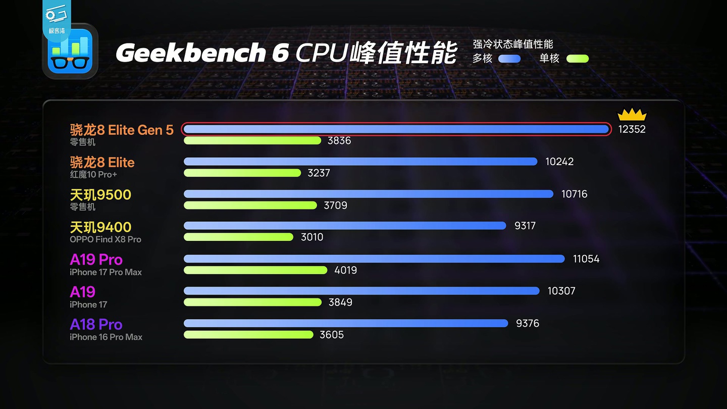 在 GeekBench 6 跑分上,高通第五代骁龙 8 至尊版的单核成绩为 3836 分,多核成绩为 12352 分。多核问鼎 2025 年旗舰手机芯片之王,而单核由于 SME2 指令集,达到了仅次于 A19 系列水平。