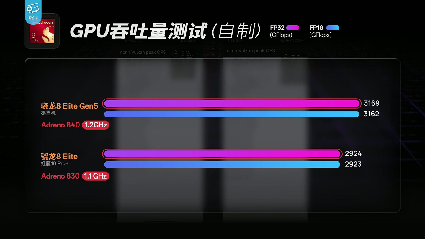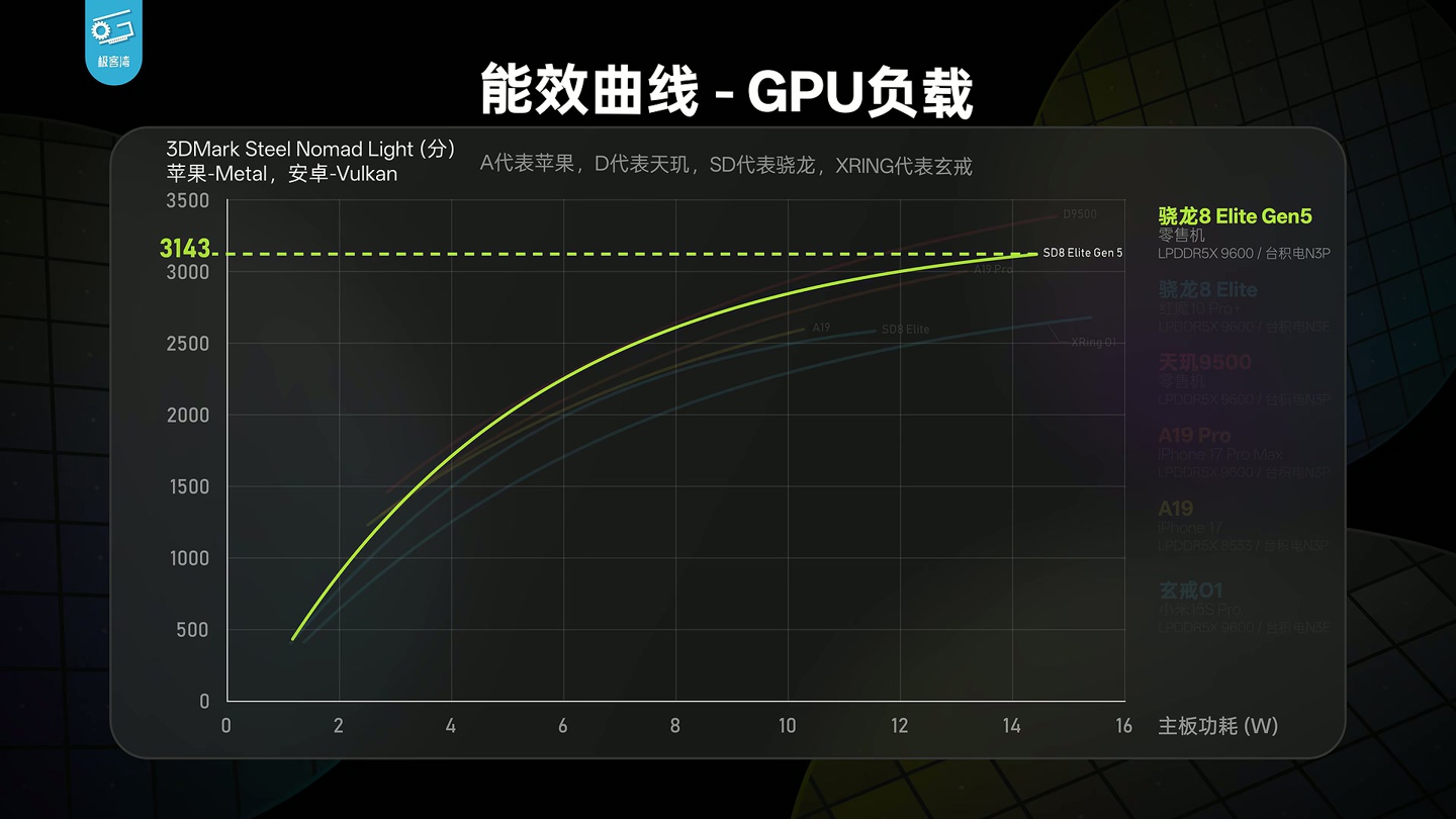 GPU 方面,高通第五代骁龙 8 至尊版芯片在 3DMark Steel Nomad Light 测试中得分 3143 分,介于天玑 9500 和苹果 A19 Pro 之间。