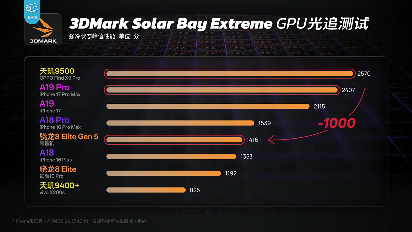 在 3DMark Solar Bay Extreme 测试中,高通第五代骁龙 8 至尊版芯片为 1416 分,比天玑 9500 和苹果 A19 Pro 低了几乎 1000 分。