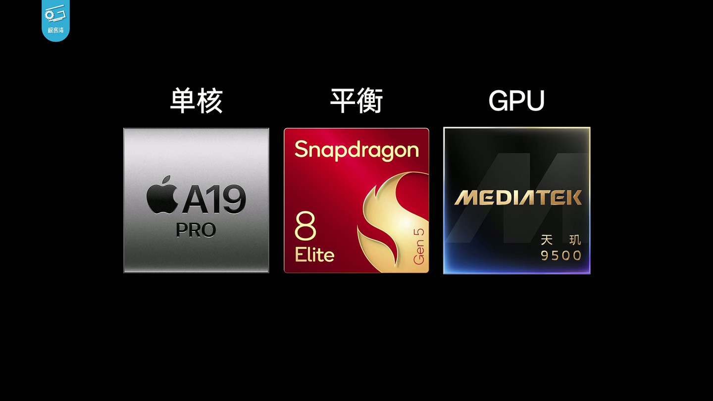 该频道认为苹果的 A 系列芯片、高通的骁龙芯片、联发科的天玑芯片在 2025 年已经进入白热化阶段,综合评价为苹果 A19 Pro 芯片单核冠绝群雄,联发科的天玑 9500 芯片 GPU 表现不错,而高通是三者中比较平衡的那个。