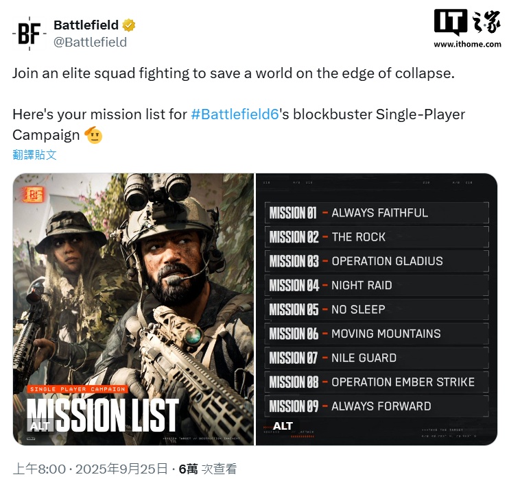alixixi 9 月 25 日消息,战地工作室今天在 X 平台公布了《战地 6》游戏的单人战役模式任务清单。