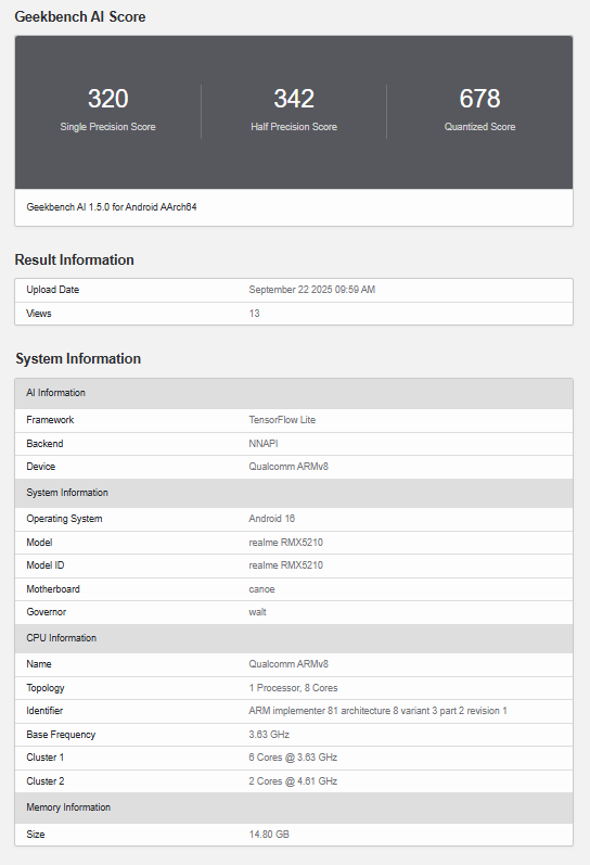 据alixixi此前报道,realme 真我 GT8 Pro 手机已现身 GeekBench AI 跑分库,型号为 RMX5210,数据库显示该机搭载骁龙 8 Elite Gen5 处理器,配备 16GB 内存并运行 Android 16 系统。