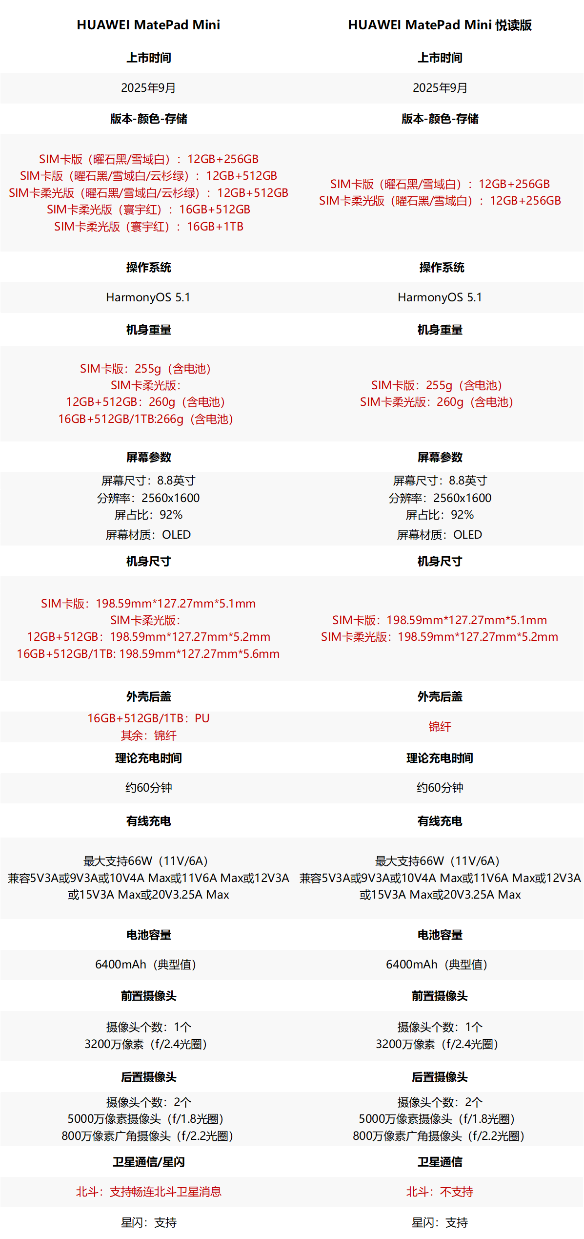 华为 MatePad Mini 系列小平板于 9 月 4 日正式发布,提供常规版和悦读版两个版本。alixixi从华为商城客服处查询获悉,悦读版主要是在外观重量、卫星通信方面和普通版有差异,可选配色更少,不支持北斗卫星消息。此外,悦读版不会在官方商城、授权电商售卖,仅供华为体验店、授权零售商。