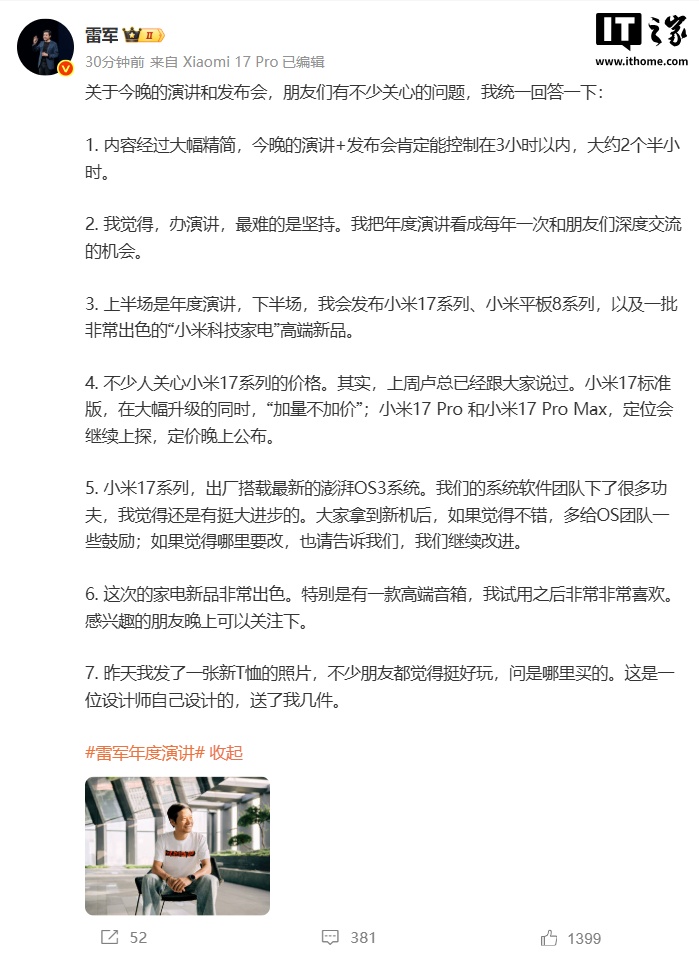雷军称,此次演讲和发布会内容经过大幅精简,肯定能控制在 3 小时以内,大约 2 个半小时。上半场是年度演讲,下半场会发布小米 17 系列、小米平板 8 系列,以及一批非常出色的“小米科技家电”高端新品。