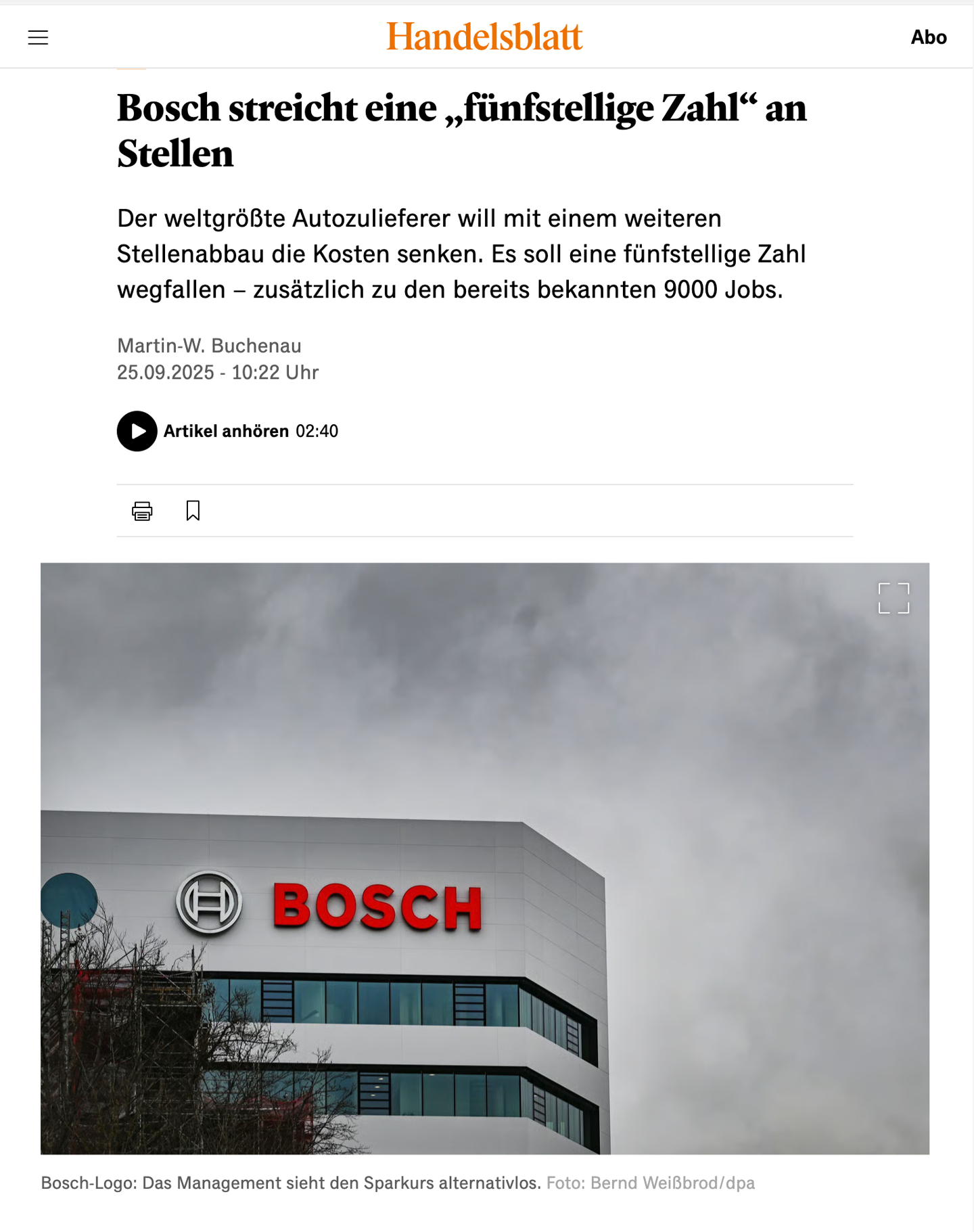 alixixi 9 月 25 日消息,据德国《商报》今日报道,博世正准备进行新一轮大规模裁员。行业消息人士向《商报》透露,裁员规模可能高达数万人。