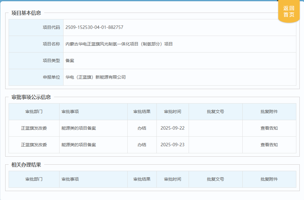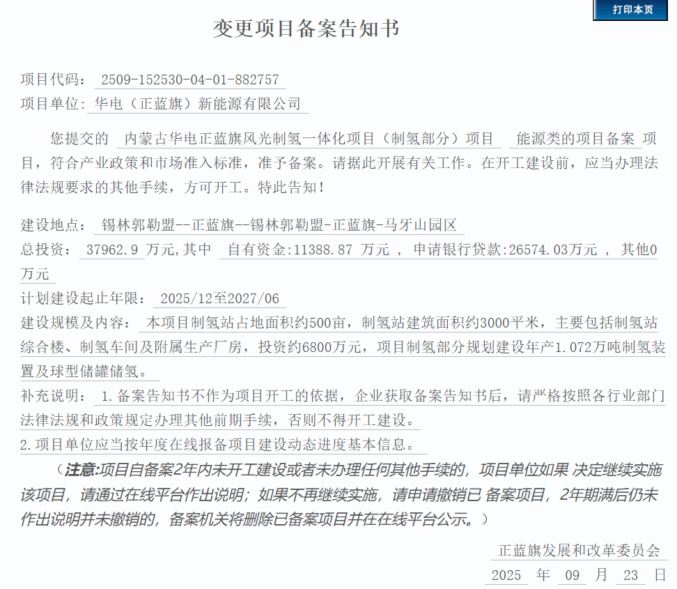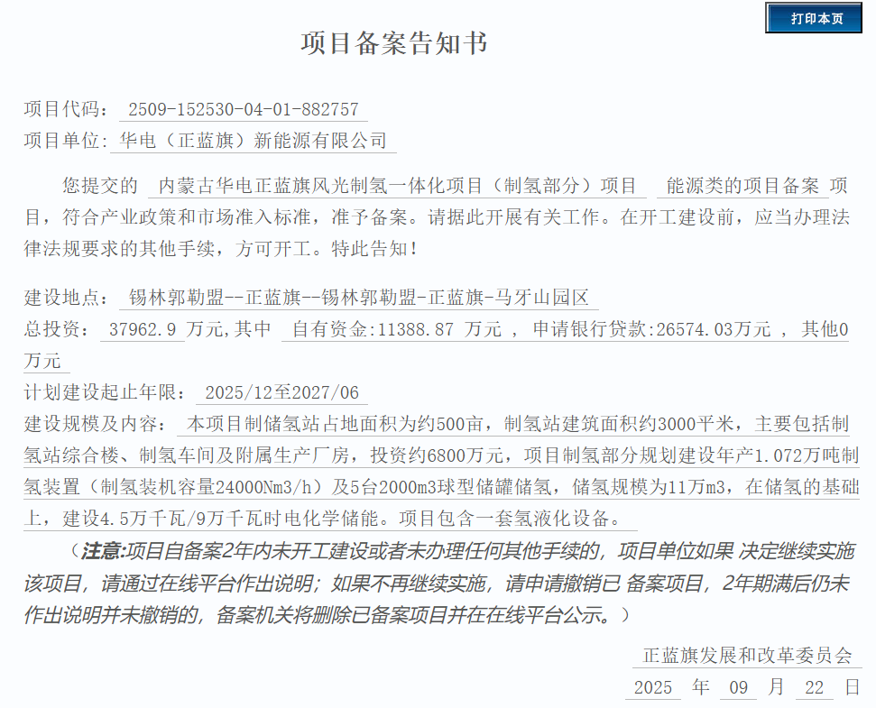 9月23日,内蒙古华电正蓝旗风光制氢一体化项目(制氢部分)项目获备案。
