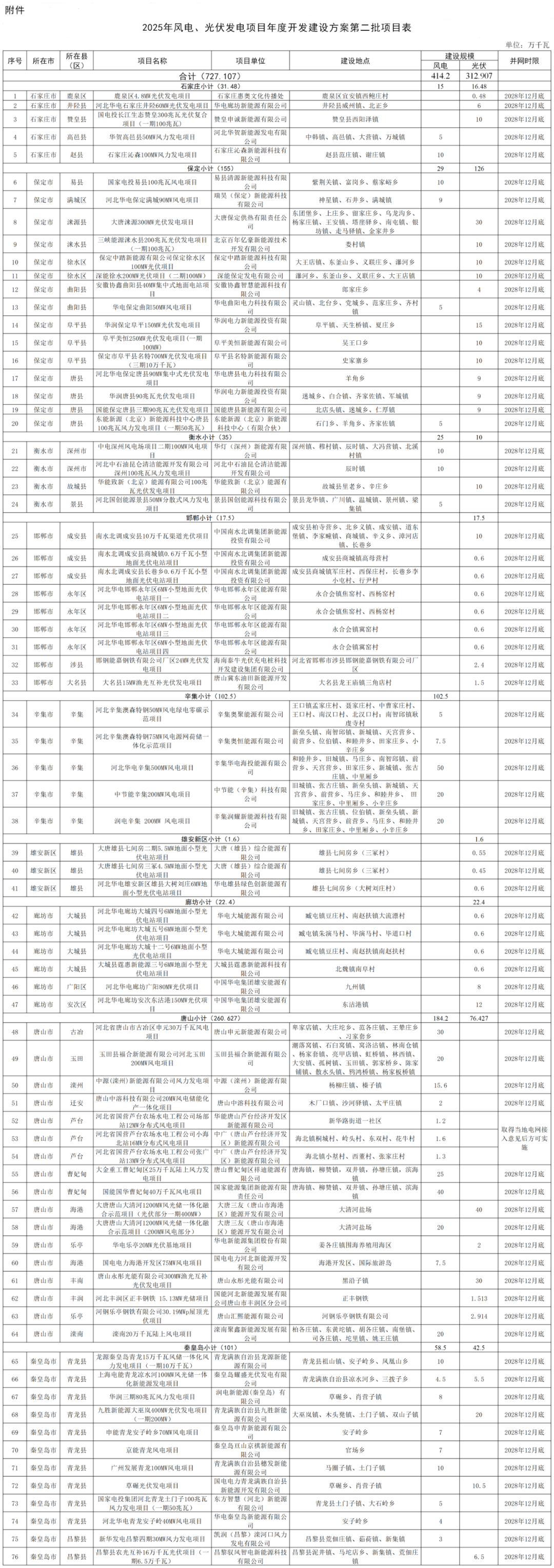 一、本批次下达年度风电、光伏发电项目共76个、727.107万千瓦(具体名单见附件)。