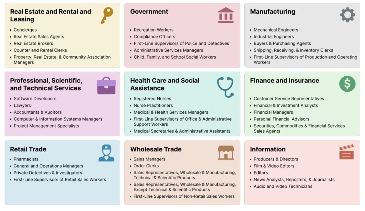 GDPval 的设计深度模拟了真实工作场景。它覆盖了对美国 GDP 贡献最高的九大行业中的 44 个职业,共计 1320 项具体任务。这些任务由平均拥有 14 年相关领域经验的专业人士创建,确保了其真实性和复杂性。