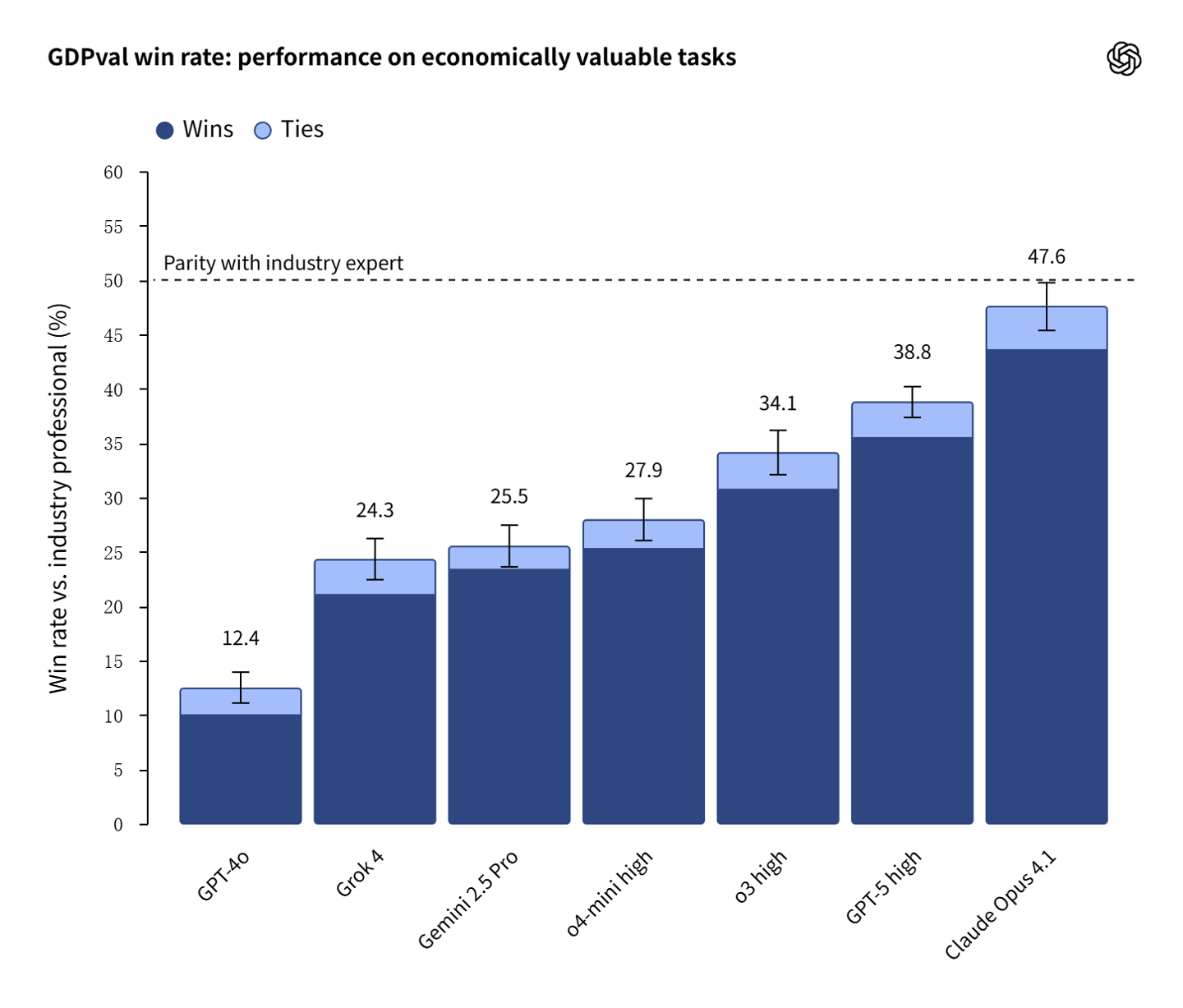 alixixi 9 月 27 日消息,科技媒体 ZDNet 昨日(9 月 26 日)发布博文,报道称 OpenAI 推出名为 GDPval 的全新 AI 评估基准,旨在衡量前沿模型在真实经济价值任务中的表现,以弥补学术测试与实际应用间的差距。