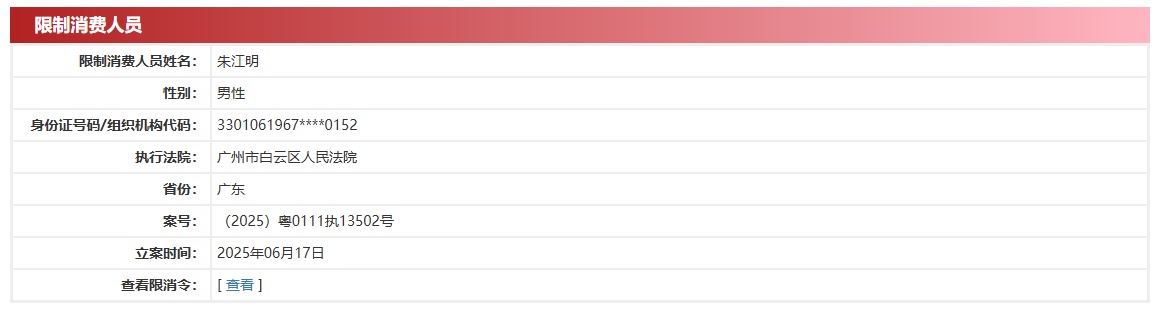alixixi注意到,零跑汽车创始人、董事长朱江明也被广州市白云区人民法院发布“限消令”。