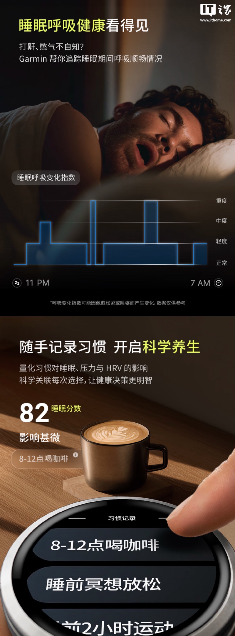 官方强调,该手表升级睡眠教练功能,能够全面解析睡眠与身体状态,同时支持记录用户习惯,量化习惯对压力、睡眠和 HRV 的影响。