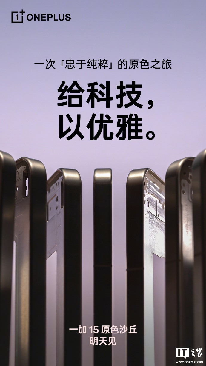 alixixi 9 月 27 日消息,一加手机刚刚宣布,一加 15“原色沙丘”明天见,官方宣称其采用一种“牛上天”的科技工艺,一场“比钛强”的工艺焕新,一次“忠于纯粹”的原色之旅。