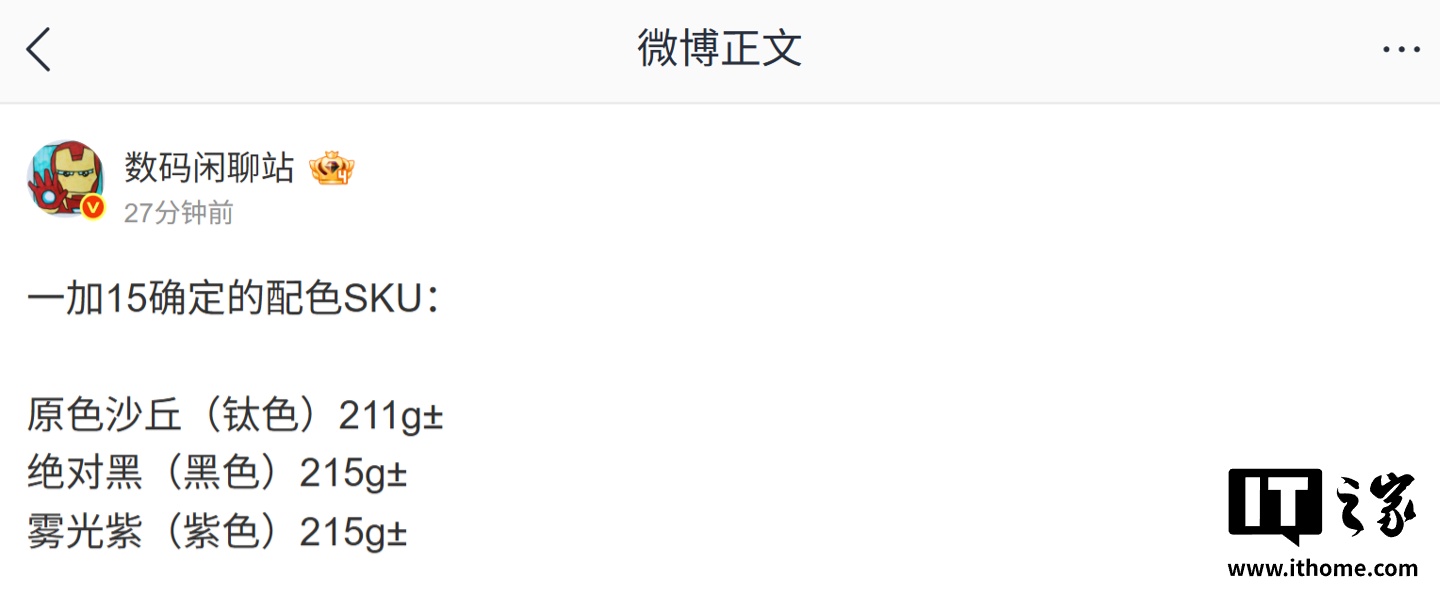 alixixi注意到,博主 @数码闲聊站 9 月 9 日在微博透露了一加 15 手机确定的配色 SKU、重量:
