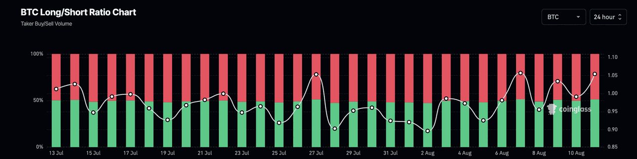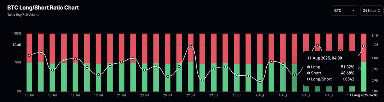 2025 年8 月11 日04:00 UTC,Coinglass 数据显示比特币多单为51.32%,空单为48.68%,多空比为1.0542。这样的接近 平衡显示市场尚无明确方向性偏好— 若出现重大催化剂,情况可能迅速改变。