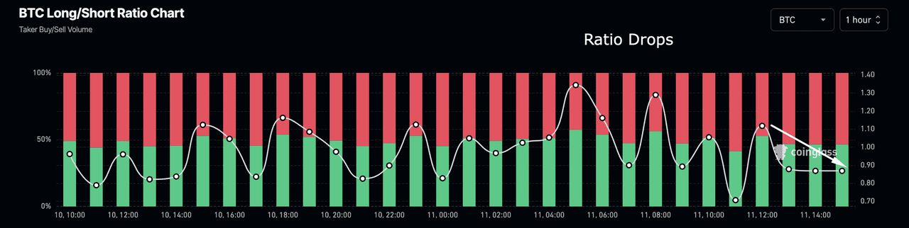 多空比高于1.0 表示多单多于空单,显示交易者偏向看涨;低于1.0 则表示空单多于多单,通常代表市场情绪偏空。